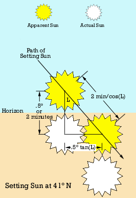 Conveniently, the diameter of the Sun is also about 0.5°, so atmospheric refraction raises the actual Sun that is just below the horizon to an apparent position that is just above the horizon. The refraction induced early rising and late setting of the Sun, then, lengthens the daylight period by (nearly) the amount of time it takes the Sun to rise and to set, and that time depends partially upon the observer's latitude.