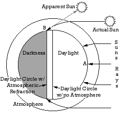 FIGURE 1. If Earth had no atmosphere, the Daylight Circle (the boundary between night and day) would divide Earth exactly in half. But sunlight (and starlight, and Moonlight) entering Earth's atmosphere is refracted as it passes through the atmosphere on its way to the surface of Earth. When the Sun is nearly overhead (at A) the refraction is negligible. Near the horizon at B (where sunlight strikes the atmosphere at a low angle and must travel through significantly more air to reach Earth's surface), atmospheric refraction can raise the actual position of an object on the horizon to an apparent position 0.5° or more above the horizon. This effect 'moves' the Daylight Circle into the night (to the left in the diagram) effectively causing slightly more than one half of Earth to be illuminated, and thereby lengthens the daylight period that simple geometry would otherwise nicely predict. |